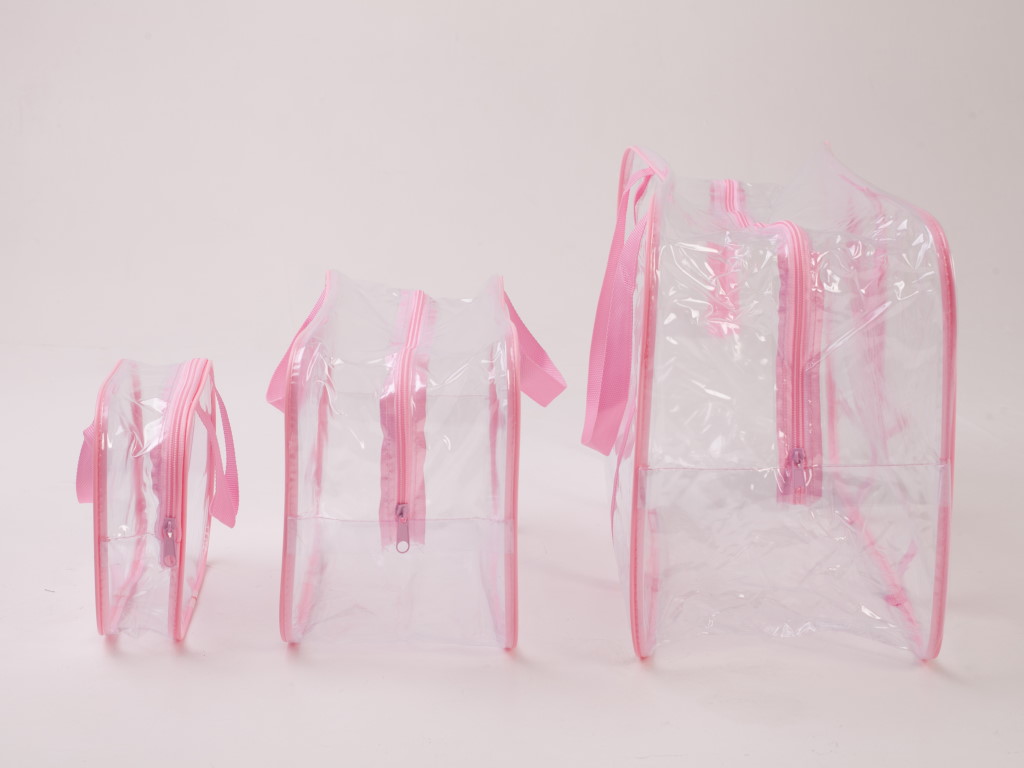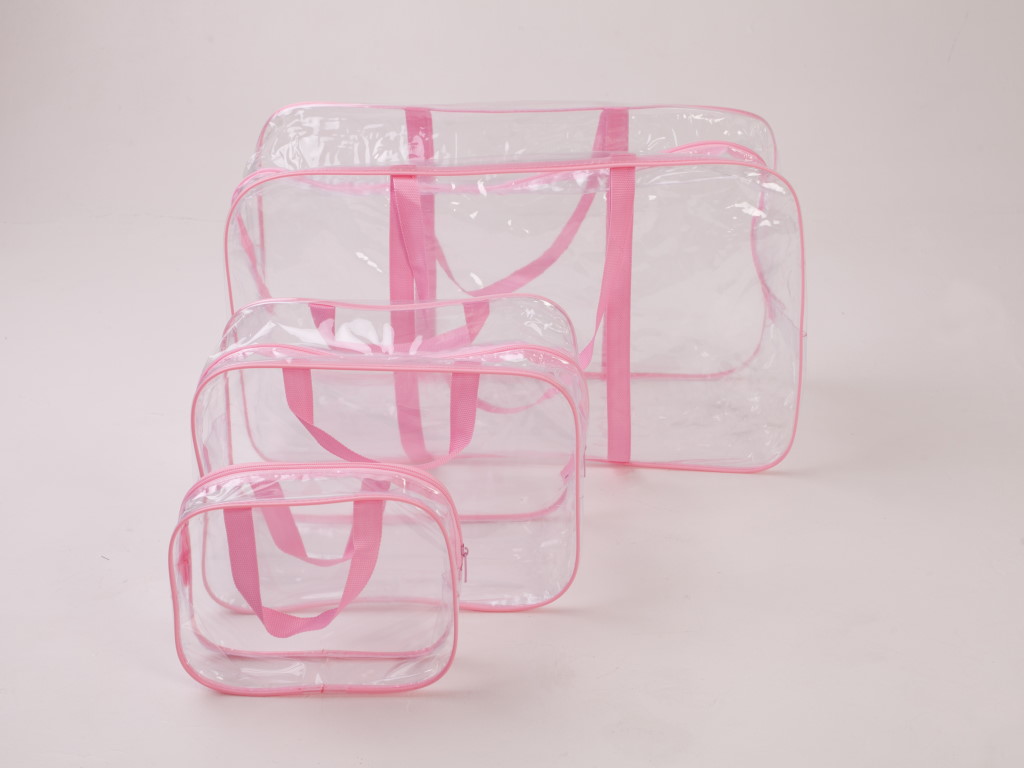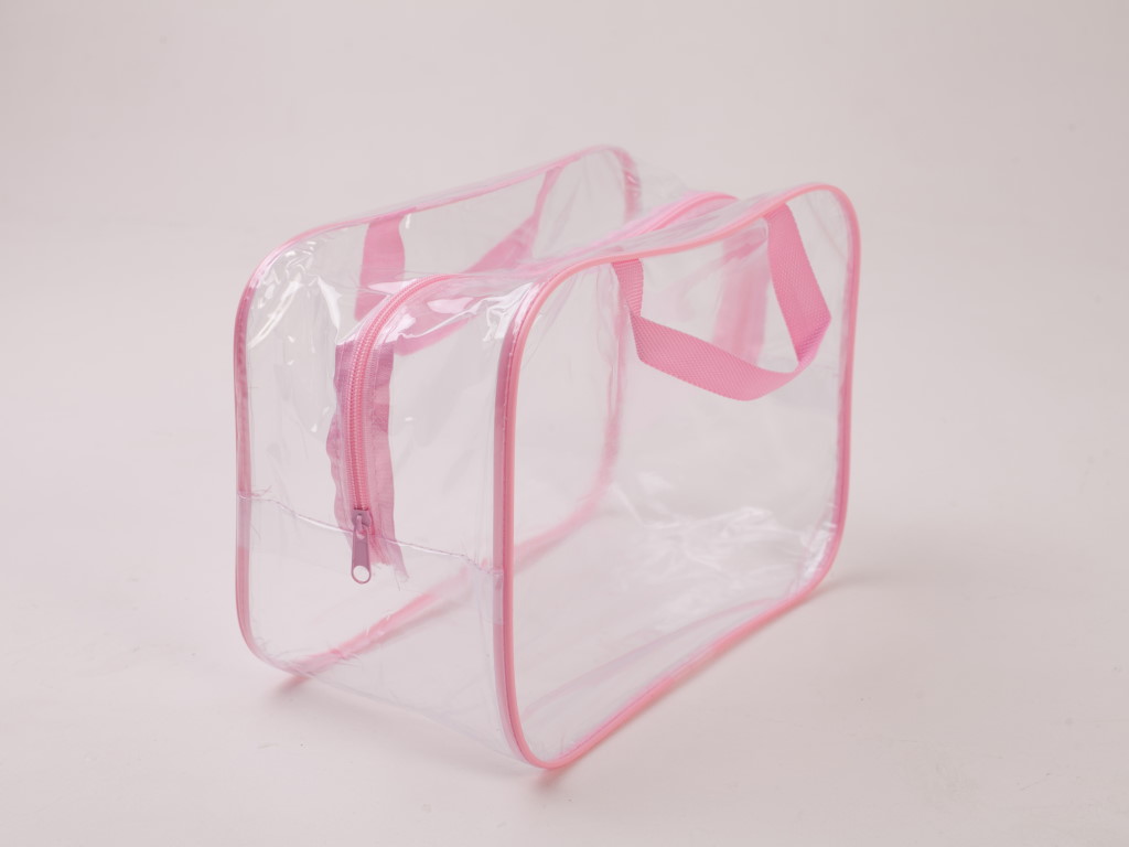 Сумка изготовлена из прозрачной пленки ПВХ, что упрощает поиск необходимых вещей в ней. В своей работе мы используем несколько видов плотностей пленки – 90 мкр, 100 мкр, 120 мкр. А так же предлагаем тонированную (цветную пленку), производства Китай.